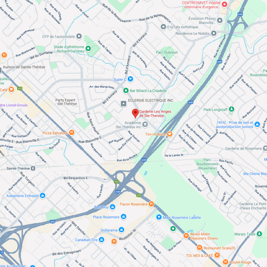 Notre garderie est située dans un quartier calme et sécuritaire de Ste-Thérèse, à proximité de Blainville, Boisbriand et autoroute 15.